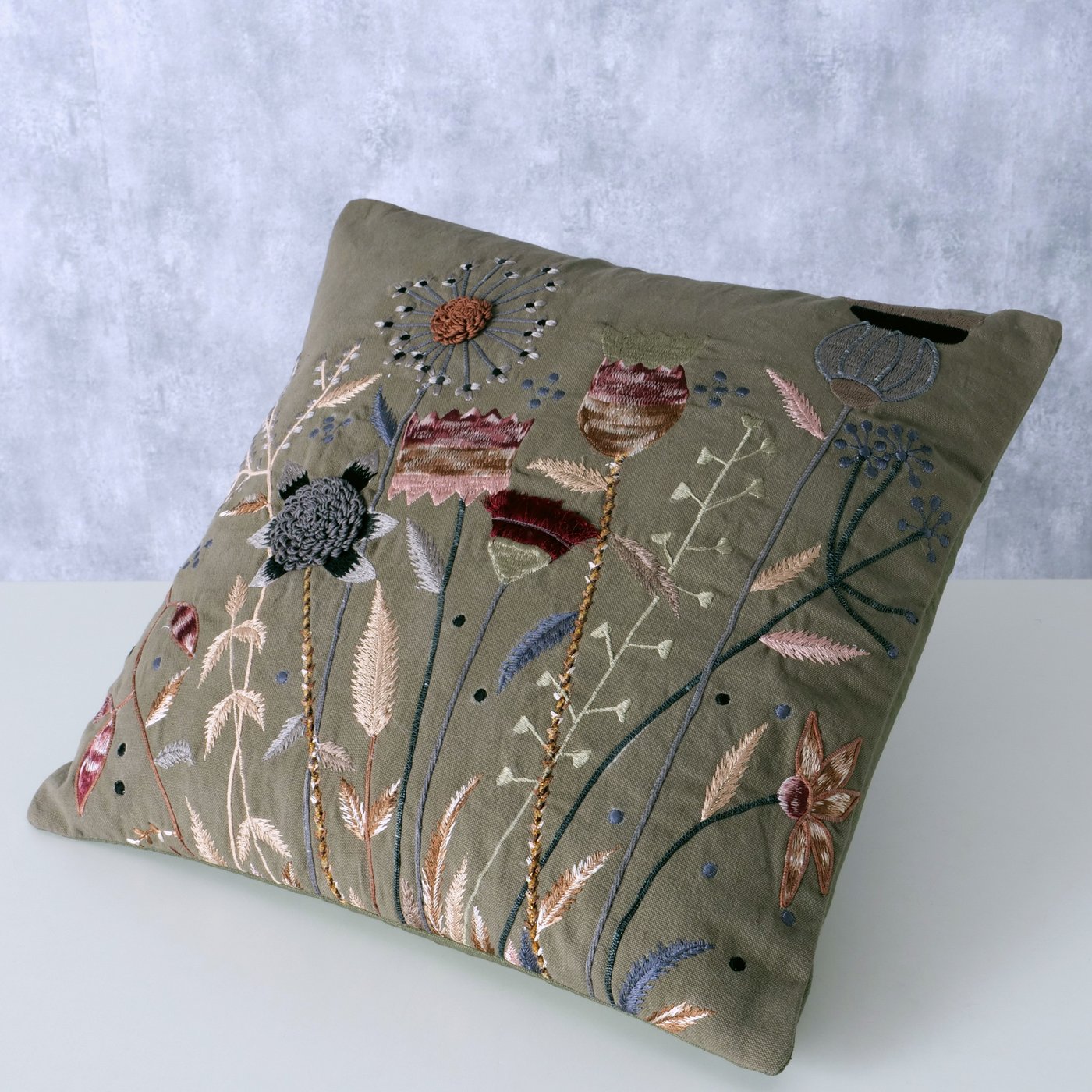 Baumwoll-Leinen Kissen Ramoni, Blumenkissen salbeigrün, rosa-beige bestickt, 45x45cm, Boltze Home Collections