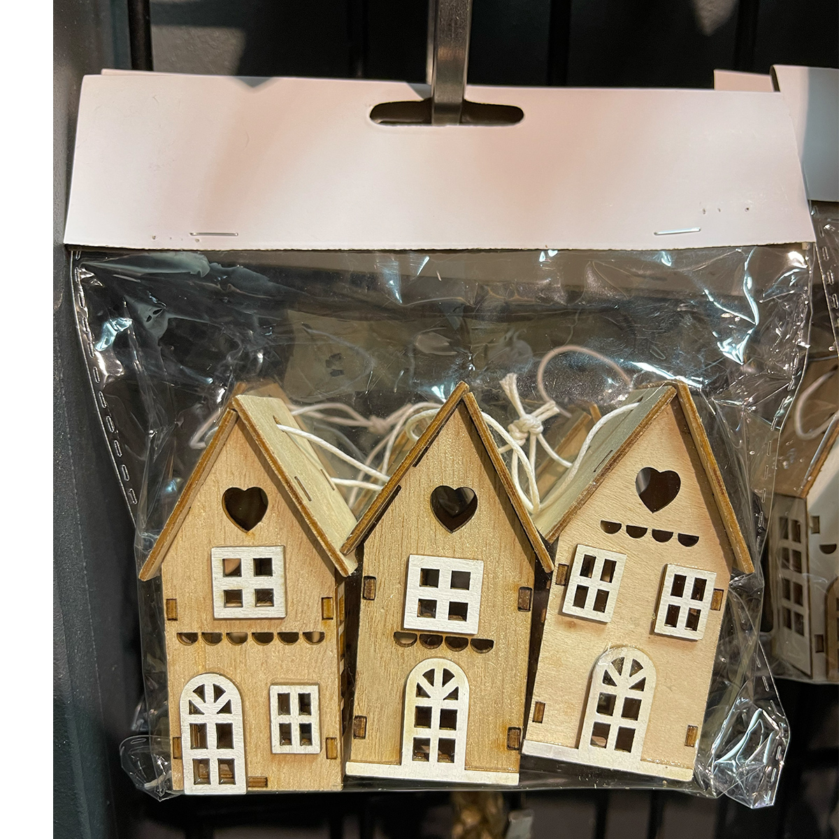 Die Holzhäuser in Natur-Weiß überzeugen durch detailreiche Fenster- und Herz-Ausschnitte und lassen sich vielseitig einsetzen – ob als stehende Tischdekoration, an Zweigen, Kränzen oder als dekorative Anhänger.
