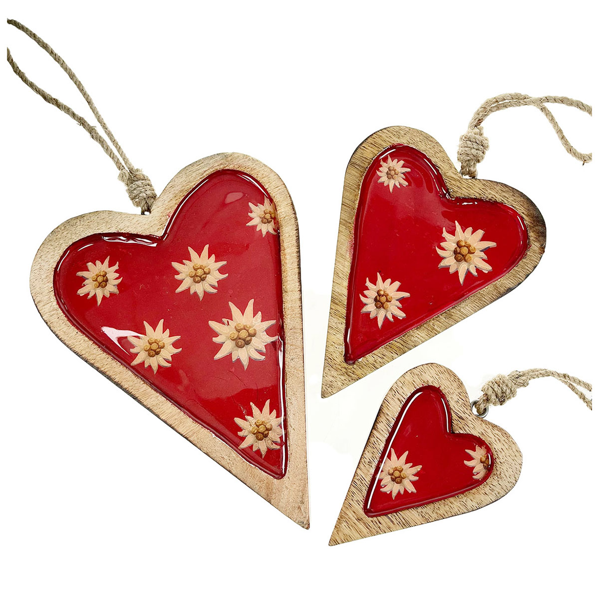 Deko Herz Landhaus, Holzherz rot mit Edelweiß, Emailleoptik, 7x10cm, Hänger