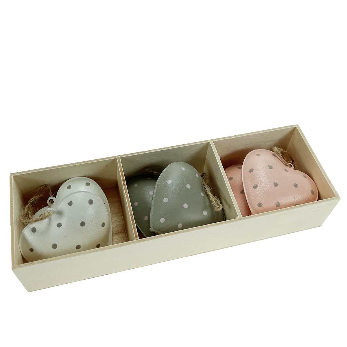 Deko Herz, Metallherze mit Punkte und Klang, rosa, grau, weiß, 3- fach sortiert, 6 St/Box, Hänger