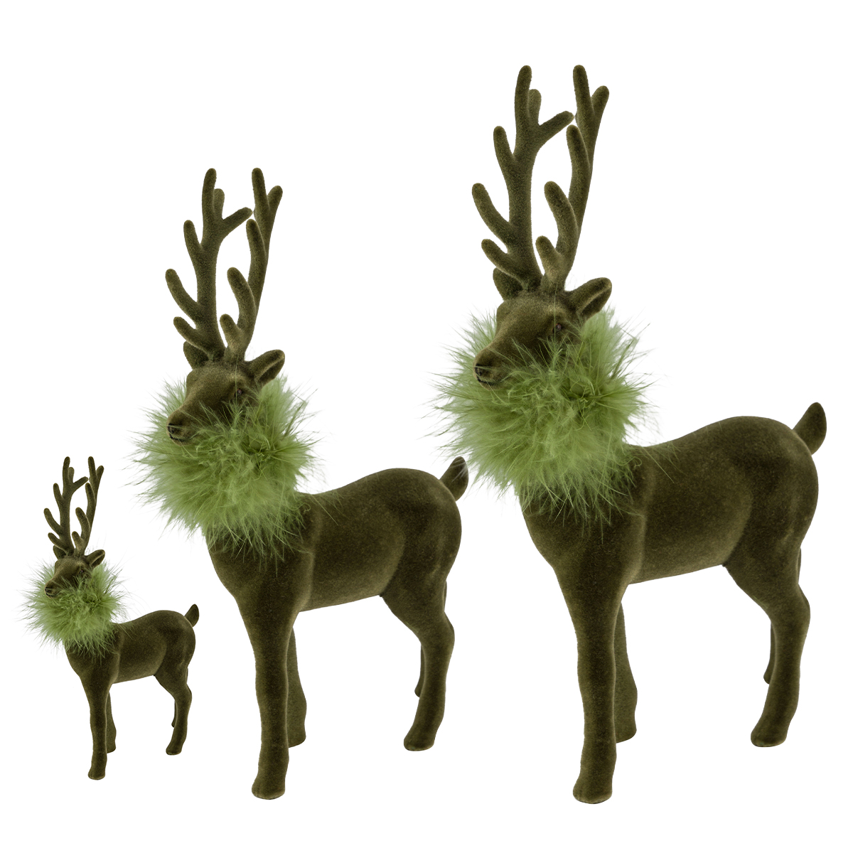 Deko Hirsch mit Federboa, olivgrüner Hirsch, samtig beflockt, 28cm