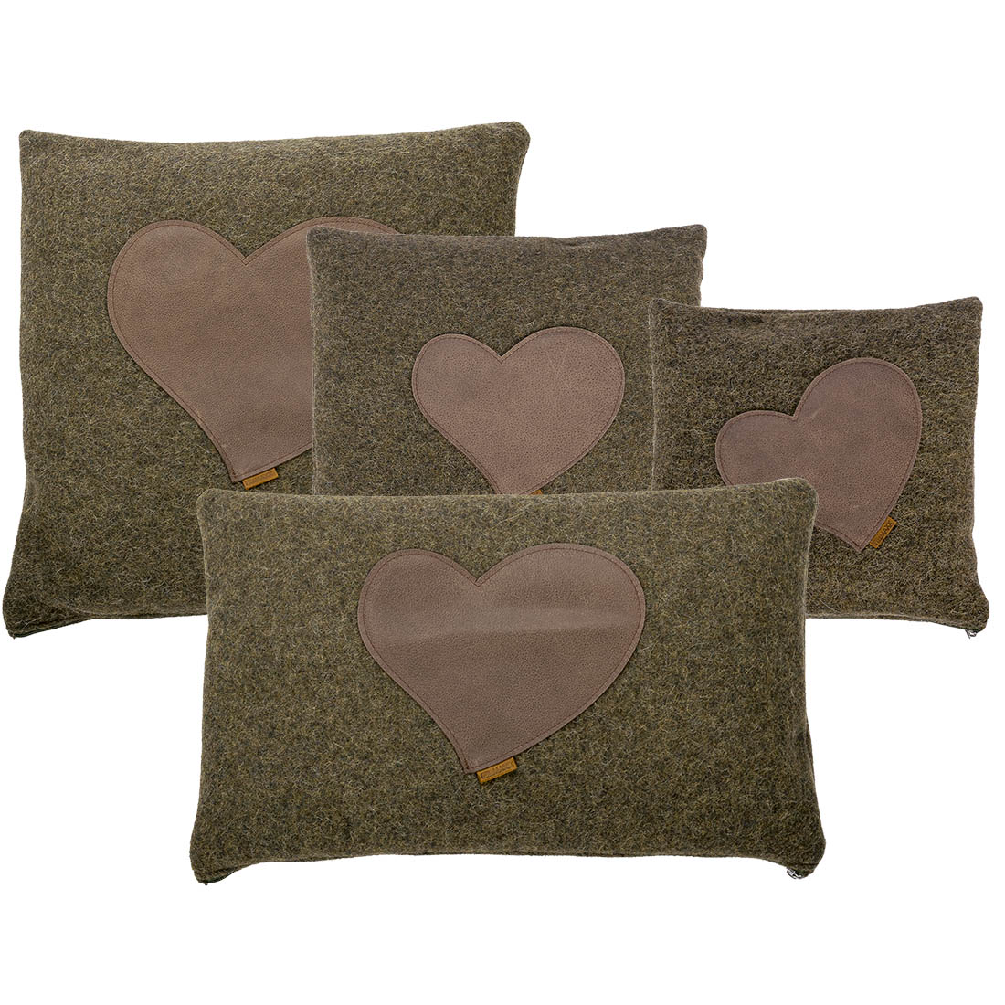 Der weiche Alpaca-Loden in warmem Moosgrün wird durch eine liebevoll gearbeitete Herzapplikation aus naturbelassenem Leder veredelt –ein stilvolles Detail, das jedes Sofa, Bett oder Landhaus-Interieur aufwertet.