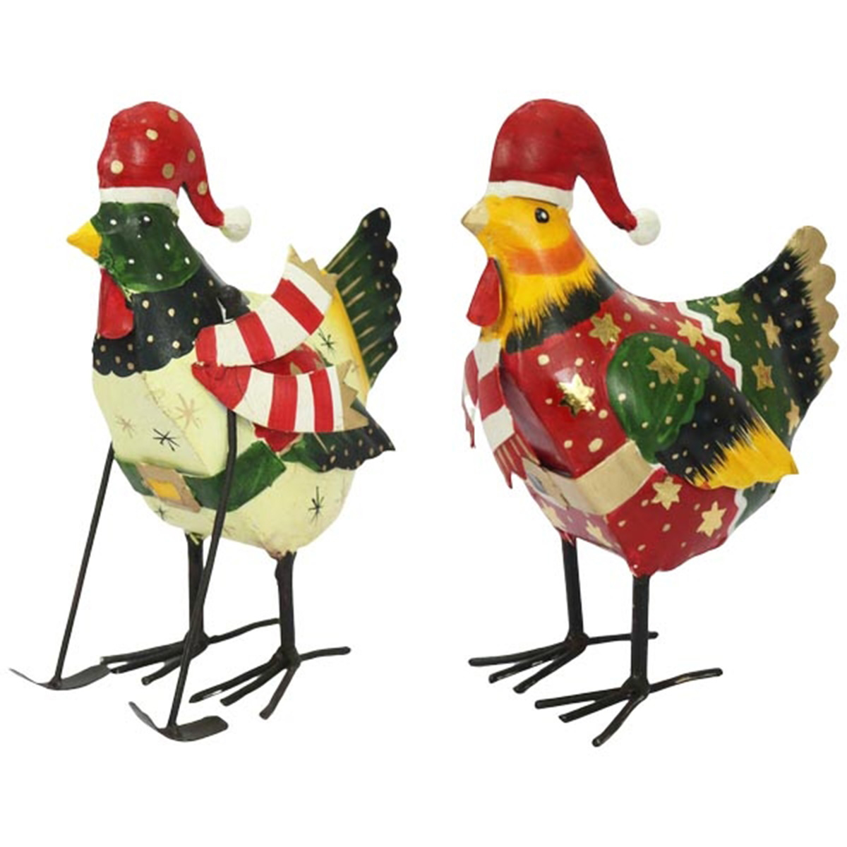 Lustiges Winterhuhn mit Skistöcke, Metallhuhn mit roter Mütze, 19cm