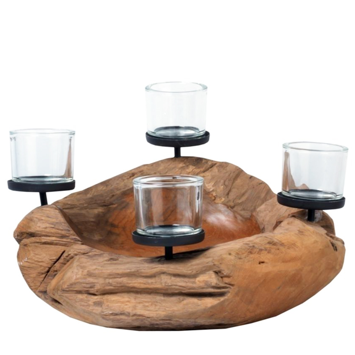 Naturholz Adventsschale Teak unfinish, rustikale Kerzenschale mit 4 Teelichtgläser, Ø50cm, WMG Grünberger