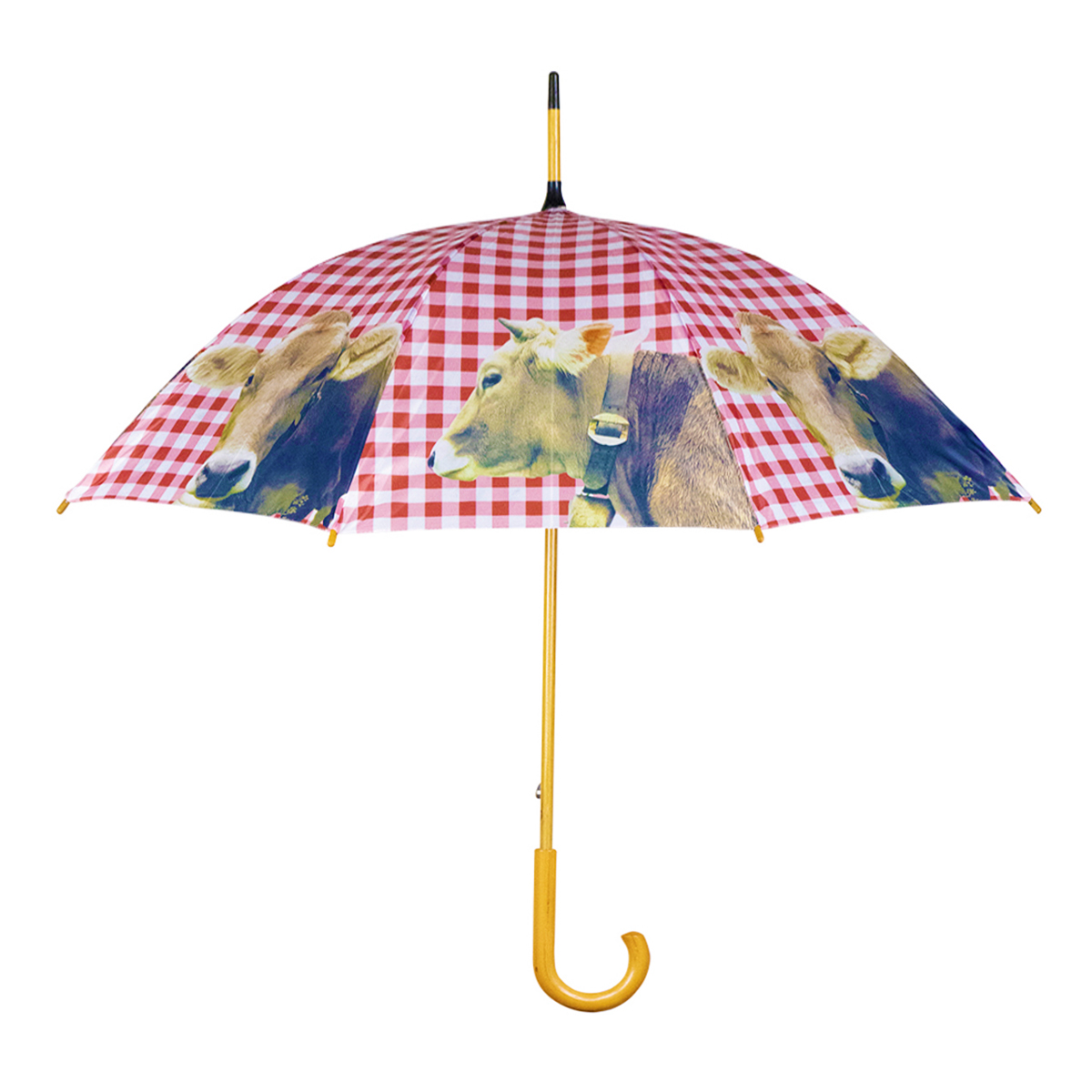 Regenschirm Kuh, Schweizer Kuh mit Glocke, Karomuster rot, 105cm, Holzgriff, Mars & More