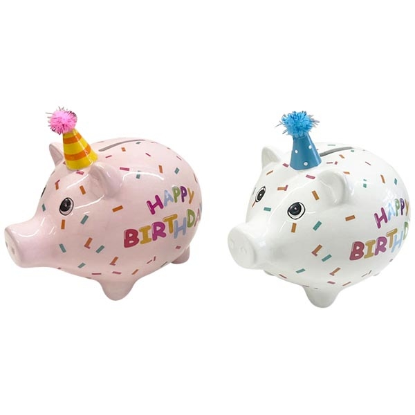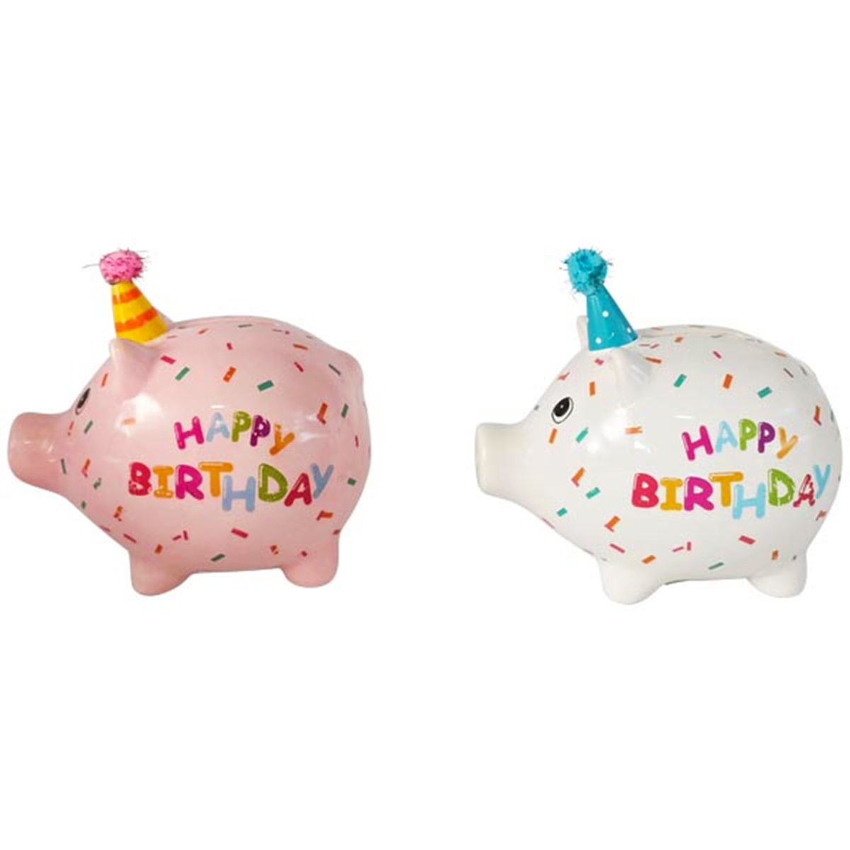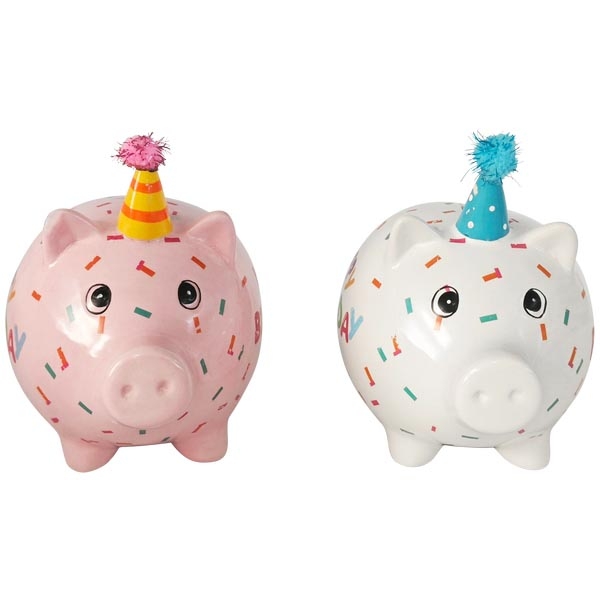 Spardose Party Schweinchen Happy Birthday, Sparschwein rosa mit Partyhut, Keramikspardose