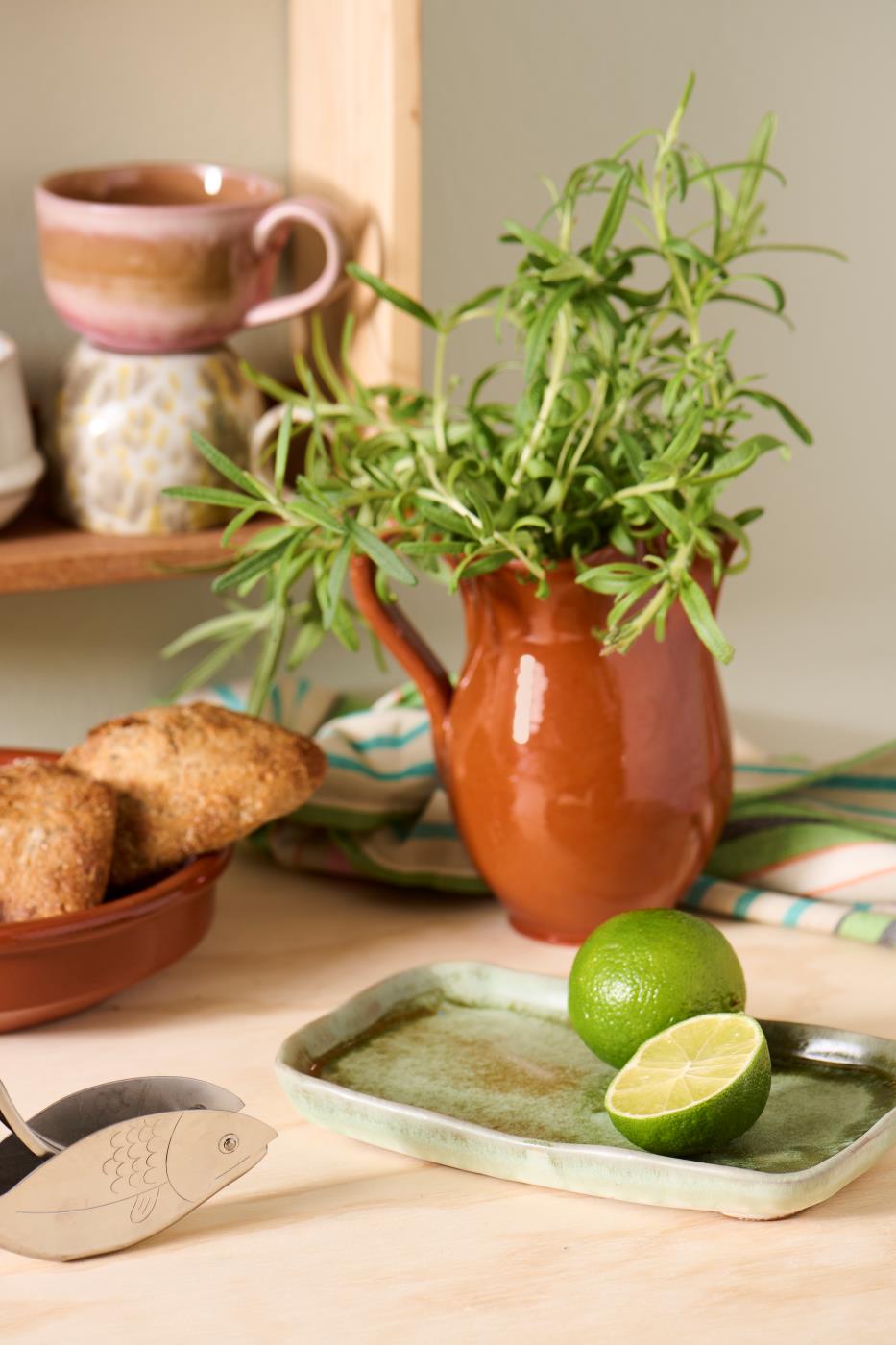 Die Glasur weist kleine Variationen auf, die dem Tablett ein einzigartiges und handgefertigtes Aussehen verleihen.
