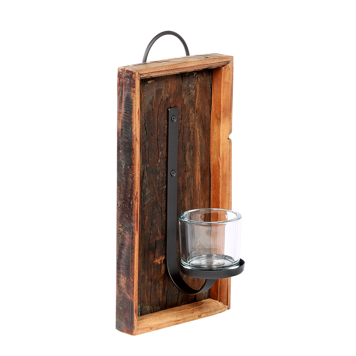 Wandleuchter Windlicht Rhinno, rustikaler Eisenleuchter auf Naturholz-Tablett, 40cm, WMG Grünberger