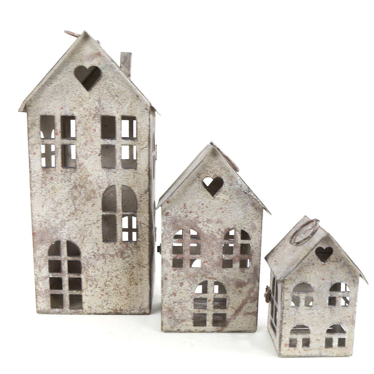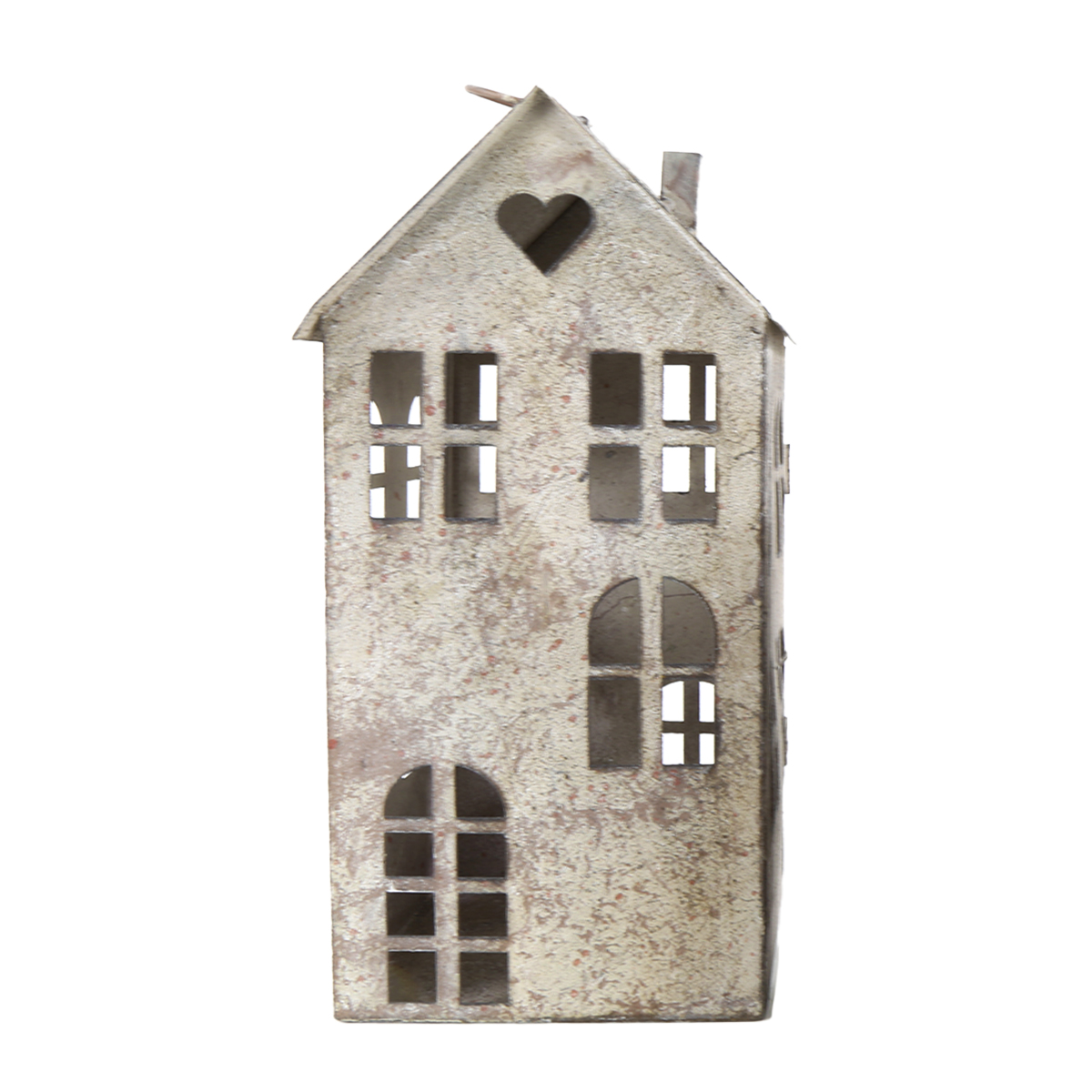 Windlicht Haus mit Herz, Metallhaus grau antik used look, 17x36cm