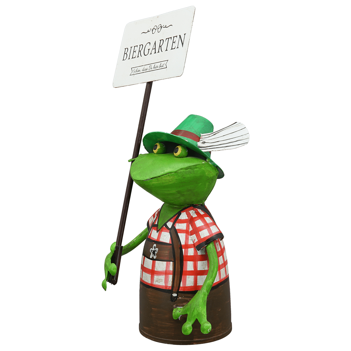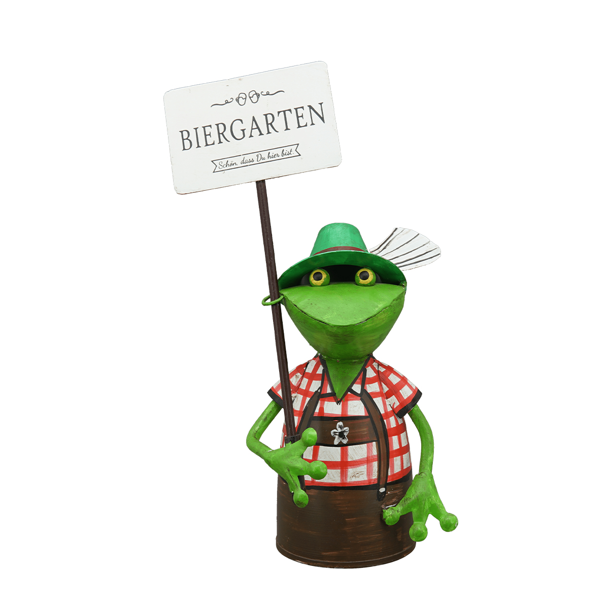 Zaunhocker Frosch Tracht, Metallfrosch in Lederhose mit Schild Biergarten, 30cm